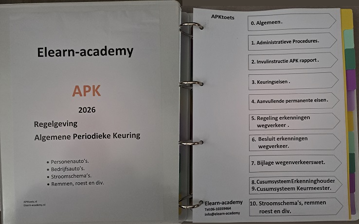 Extra bij te bestellen bij de online-training: "Werkmap met de APK-Regelgeving 2026, stroomschema's, voertuigspecifieke gegevens, advies- en reparatie -punten, roest en remmen info". De werkmap APK-regelgeving 2026 mag gebruikt worden tijdens het examen bevoegdheidsverlenging. Voor informatie IBKI klik hier voor meer informatie.